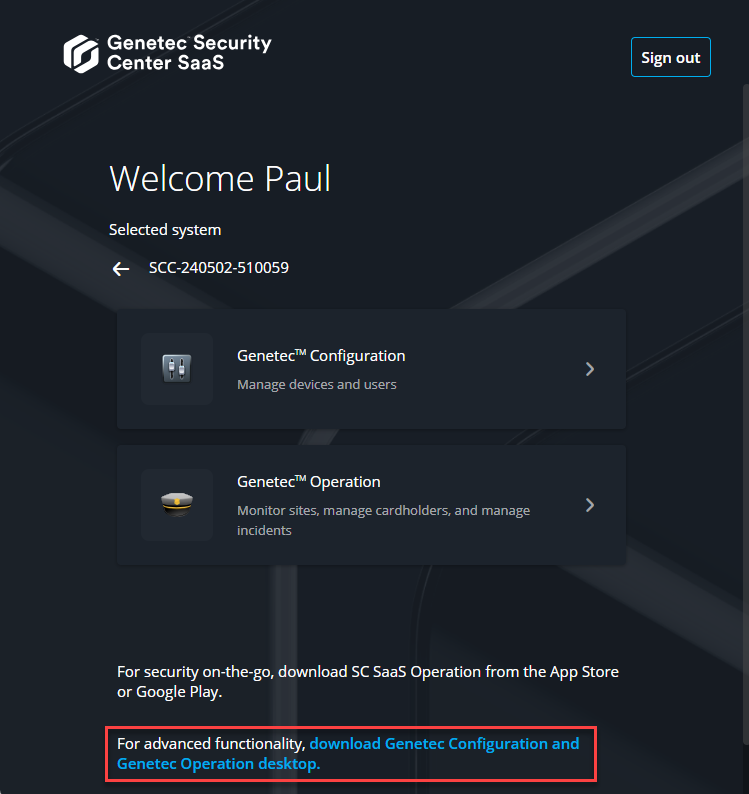 Desktop-Clients können von der Willkommensseite heruntergeladen werden, wenn Sie sich bei einem Security Center SaaS-Web Client anmelden.