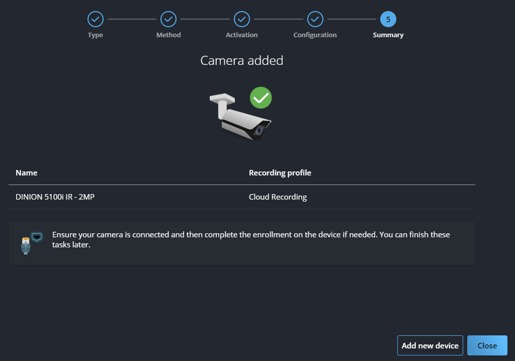Die Seite Zusammenfassung des Assistenten wird geöffnet und zeigt Details der registrierten Kamera an.