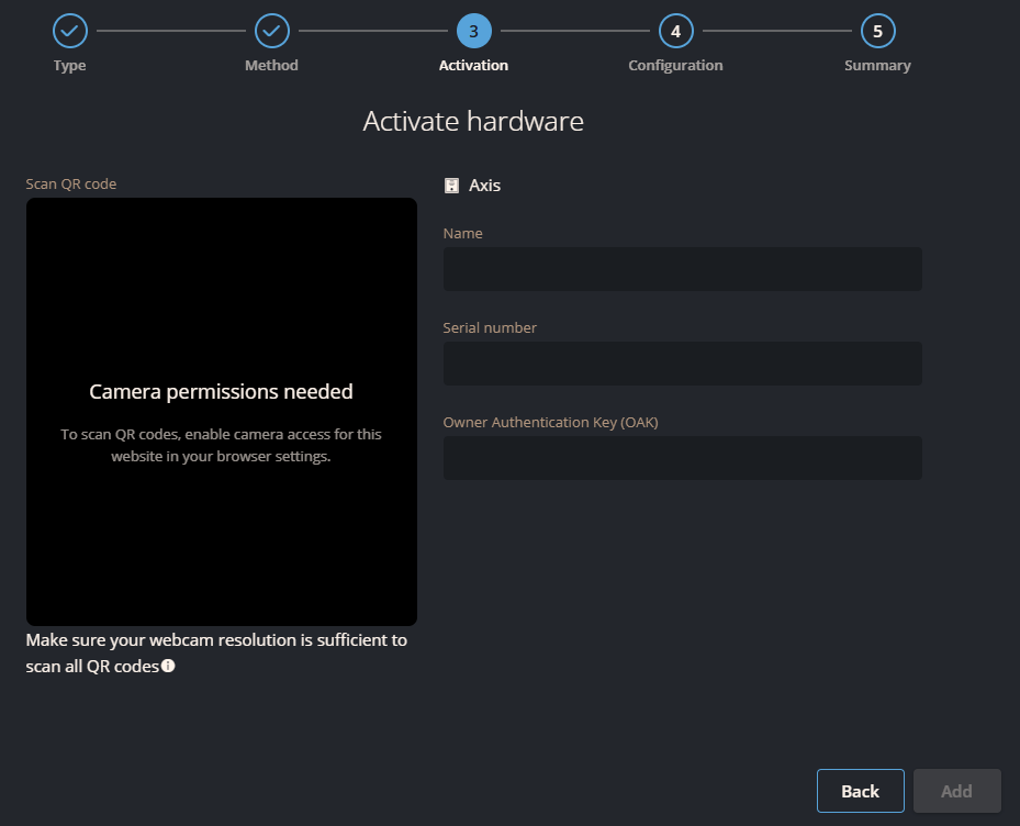 - Halten Sie den QR-Code oder die Seriennummer und den Owner Authentication Key (OAK) für die Sprechanlage bereit. Diese Informationen sind im Dokument Axis Communications: Owner Authentication Key enthalten, das mit dem Gerät geliefert wird. Alternativ können Sie die Seriennummer und OAK über die Webschnittstelle des Geräts abrufen.