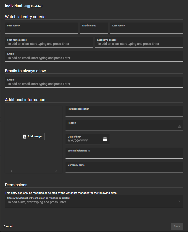 Fügen Sie einen oder mehrere einzelne Watchlist-Einträge hinzu, damit Sie einzelne Besucher prüfen und automatisch Aktionen zum Blockieren oder Benachrichtigen auf Standort- oder globaler Ebene durchführen können, wie in der Watchlist-Konfiguration angegeben.