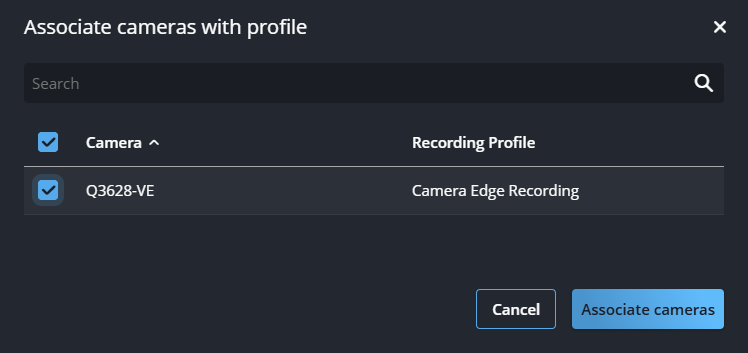 Beim Auswählen von Kameras, die mit einem Aufzeichnungsprofil verknüpft werden sollen, werden nur relevante Kameras in der Liste angezeigt. In einem Edge-Aufzeichnungsprofil werden beispielsweise nur Kameras angezeigt, die Edge-Aufzeichnung unterstützen.