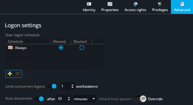 Um die Anzahl von Workstations zu begrenzen, bei denen sich ein Benutzer gleichzeitig anmelden kann, aktivieren Sie die Option Gleichzeitige Anmeldungen beschränken, und geben Sie die Anzahl der Workstations ein.