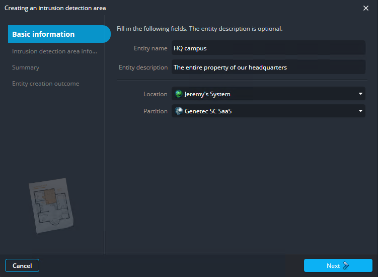 Klicken Sie auf der Seite Informationen zum Einbruchserkennungsbereich auf die Liste Einbruchserkennungsbereich , wählen Sie eine Einheit aus, die diesen Bereich kontrollieren soll, und klicken Sie auf Weiter.
