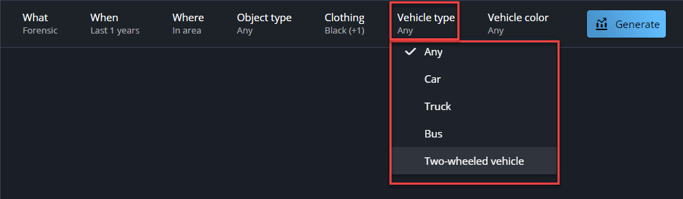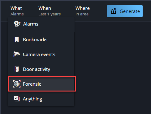 - Um einen Bericht für die Forensische Suche zu erstellen, muss Ihr Security Center SaaS-System Kameras enthalten, die Videoanalyseereignisse aufzeichnen können. Eine Liste der unterstützten Kameras und der von ihnen unterstützten Videoanalysefunktionen finden Sie in der Liste der unterstützten Geräte.