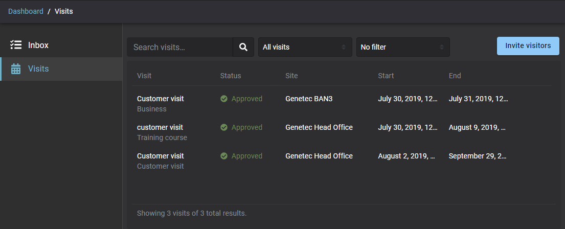 Bereichseigentümer, Sicherheitspersonal und die Rezeption können aktuelle oder bevorstehende Besuche oder Ereignisse für ihre Bereiche überprüfen. Besuche können für die Bewirtung anderer Standortmitarbeiter, Wartungsunternehmen, Termine, Besprechungen, Vorstellungsgespräche, Kundenbesuche, Geschäftspartnerkonferenzen usw. angefordert werden.