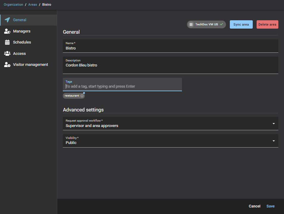 In Genetec ClearID™ ist ein Bereich eine logische Einheit, die die Beziehung zwischen Synergis™ Türen und Bereichseigentümern definiert. Bereiche werden vom Bereichseigentümer verwaltet.