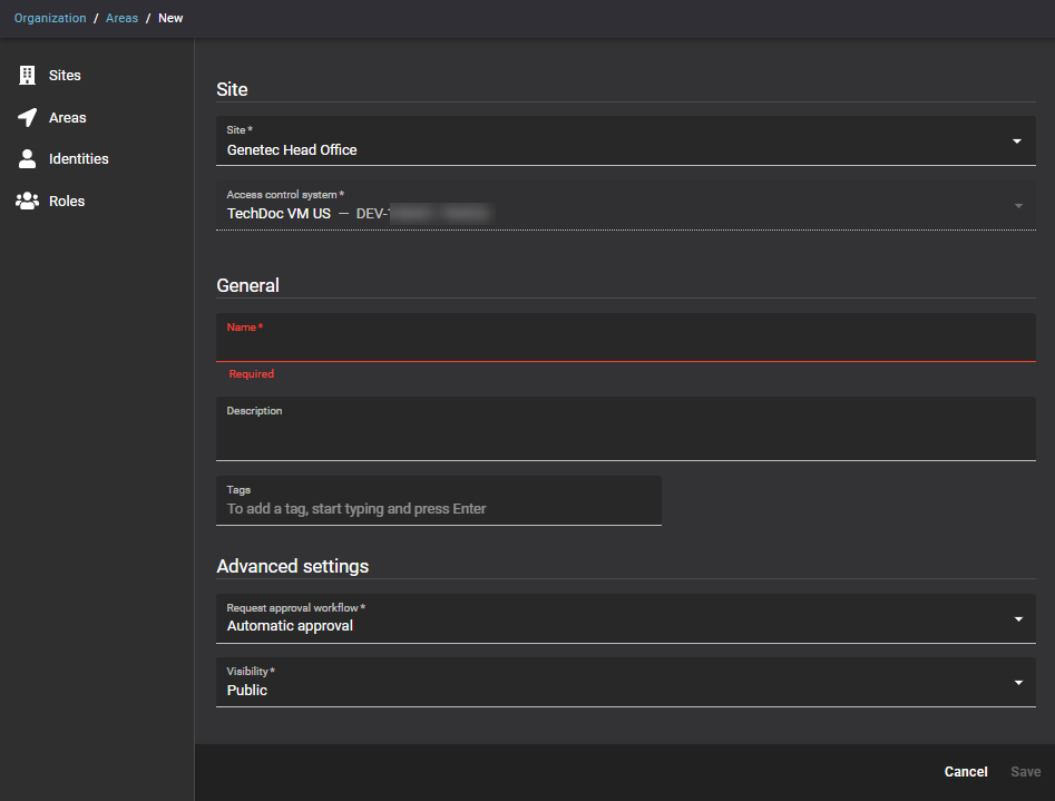 Dieses Feld wird basierend auf dem zuvor ausgewählten Standort vorausgefüllt. Dieses Zutrittskontrollsystem wird verwendet, um Änderungen in ClearID mit Security Center SaaS zu synchronisieren.