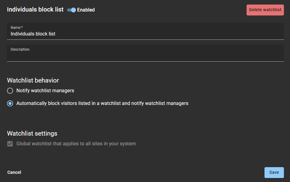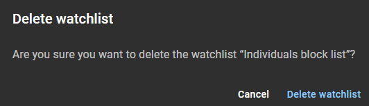 Ein Watchlist-Manager kann Watchlists löschen, die veraltet sind oder nicht mehr benötigt werden. Oder eine Watchlist muss gelöscht werden, wenn Sie eine Standort-Watchlist in eine globale Watchlist ändern müssen oder umgekehrt.