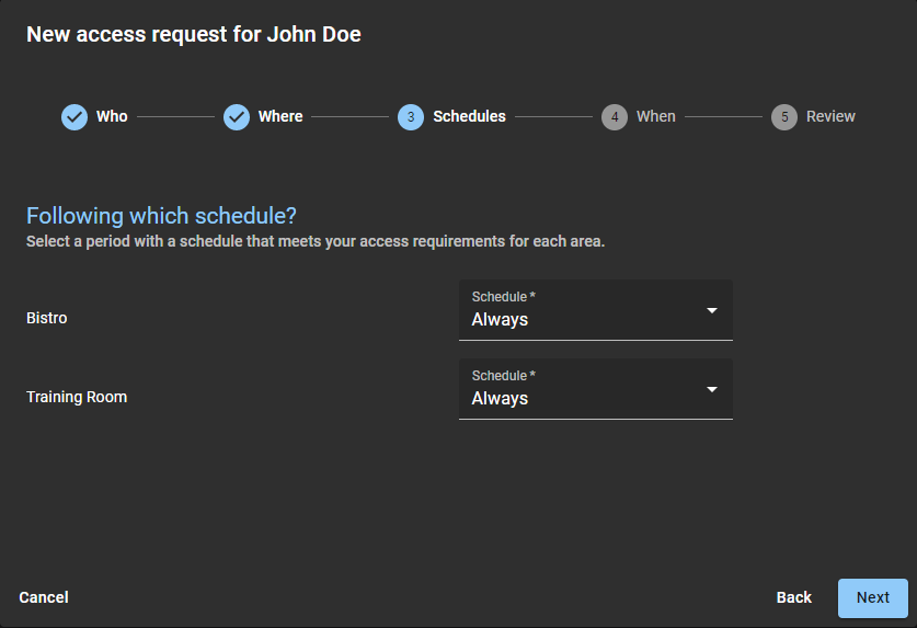 Wählen Sie im Abschnitt Zeitpläne des Dialogfelds Neue Zutrittsanfrage den Zeitplan aus, der für die einzelnen Bereiche erforderlich ist.