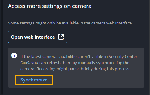 - Wenn die neuesten Kamerafunktionen nicht in Security Center SaaS angezeigt werden, können Sie Ihre Kamerafunktionen manuell aktualisieren. Durch diesen Vorgang werden die Kamerafunktionen aktualisiert, ohne dass die Kamera oder eine zugehörige Genetec Cloudlink™-Appliance neu gestartet werden muss.