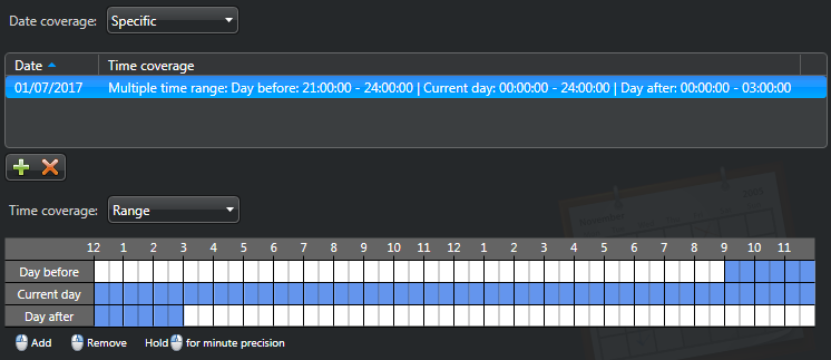 To define a set of time constraints for situations that occur on specific dates, where each date can have a different time coverage, you can define schedules with specific dates and then apply them to entities.