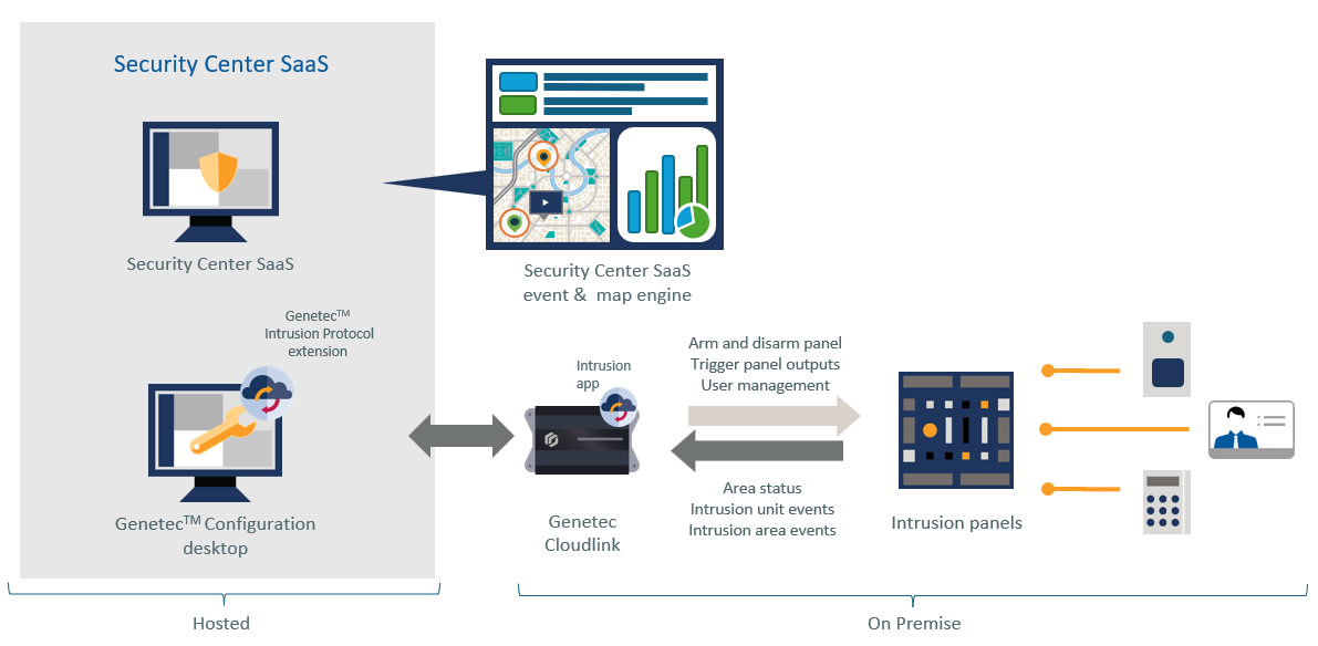 - The Intrusion app includes a Genetec™ Intrusion Bridge, which connects intrusion panels to Security Center SaaS and relays events and commands.