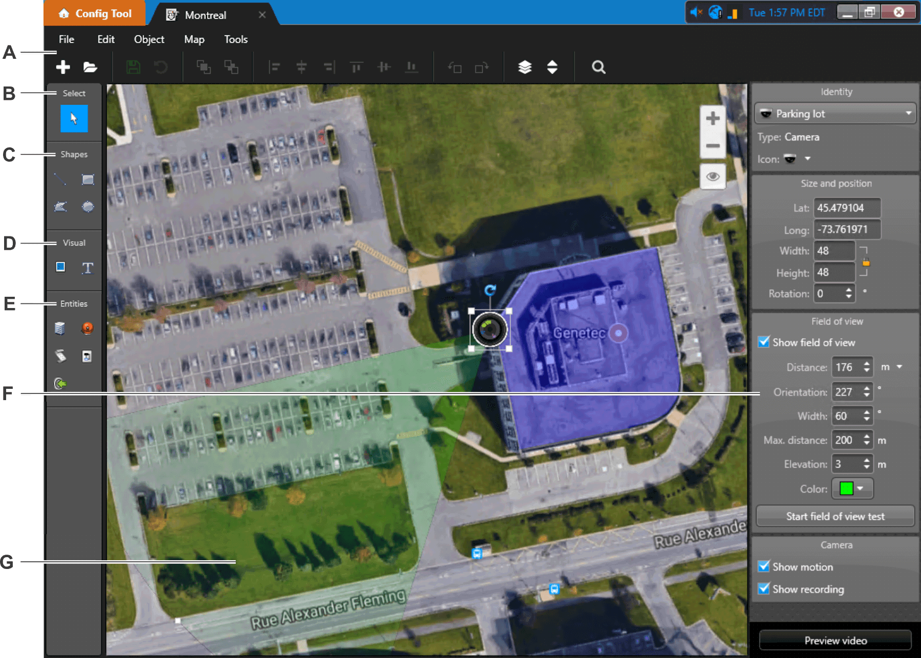 detection areas, cameras, camera sequences, monitoring layouts, doors, ALPR