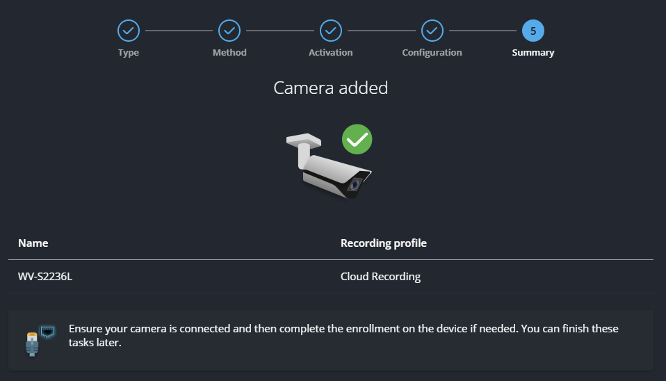 Se abre la página Resumen del asistente, que muestra detalles de la cámara registrada.