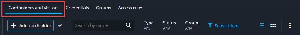 Se abre la página de Tarjetahabientes y visitantes. - Haga clic en Añadir tarjetahabiente.