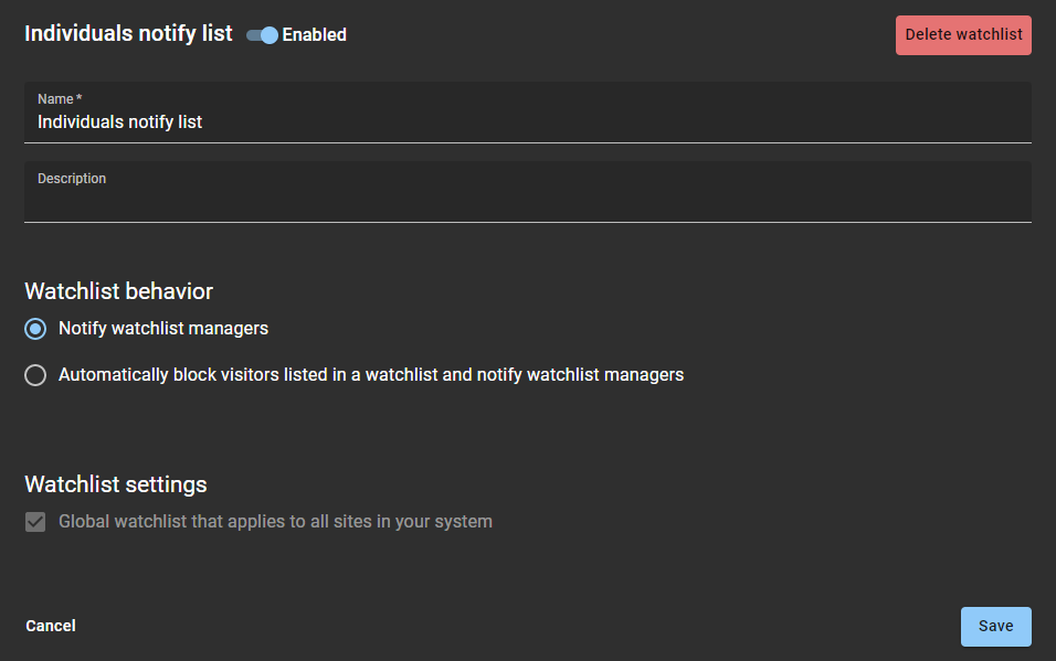 Después de agregar sus listas de seguimiento, puede modificarles algunas configuraciones. Un administrador de listas de vigilancia puede desactivar una lista de vigilancia, cambiar el nombre o la descripción y cambiar el comportamiento de la lista de vigilancia.
