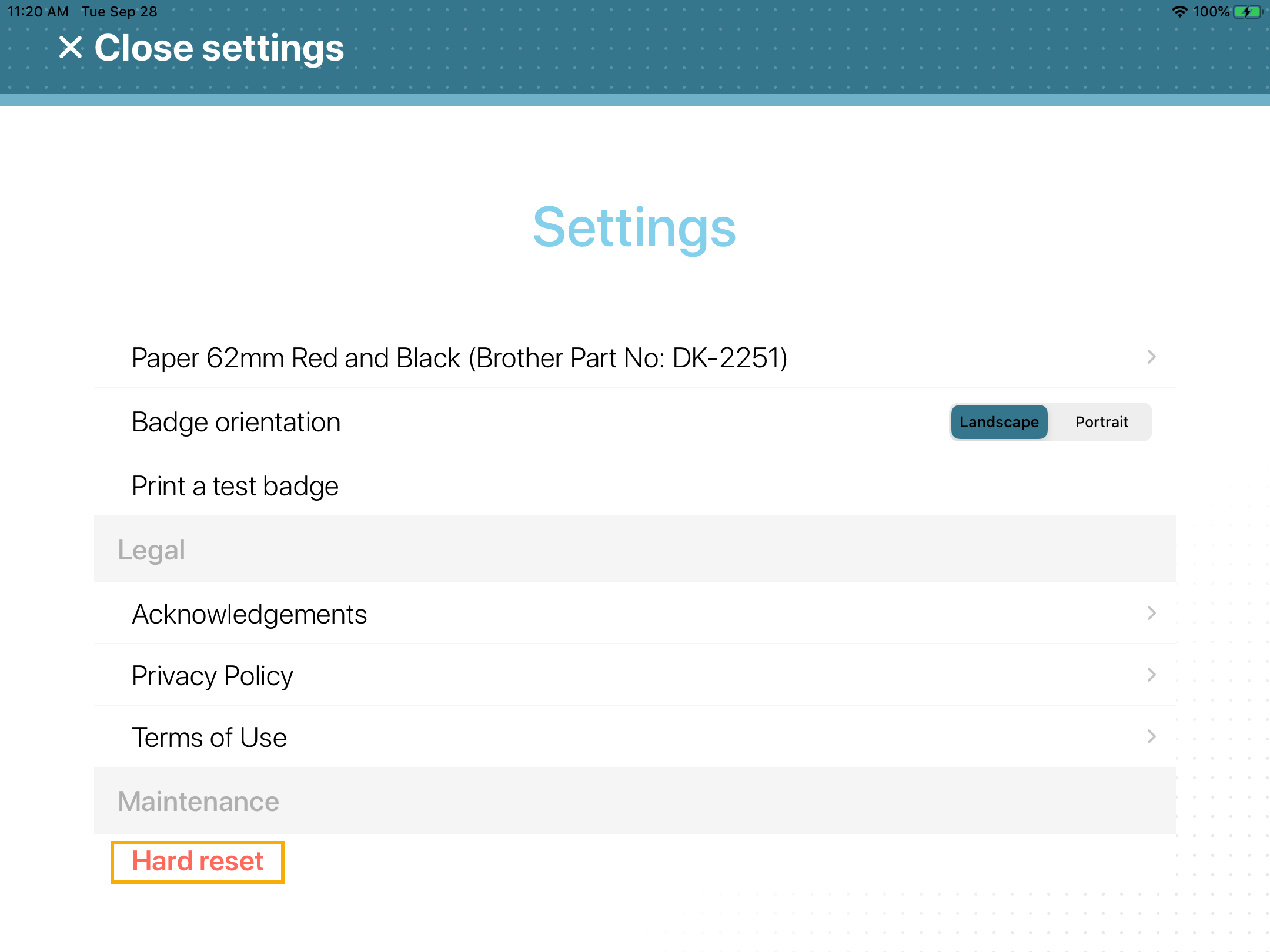 Dans certains cas, vous souhaiterez effectuer une réinitialisation complète de l’application mobile Genetec ClearIDMC Self-Service Kiosk. Par exemple, si vous rencontrez des problèmes pour sélectionner l'imprimante d'étiquettes, imprimer les étiquettes, afficher les personnes, ou si vous souhaitez déplacer la borne vers un autre site.