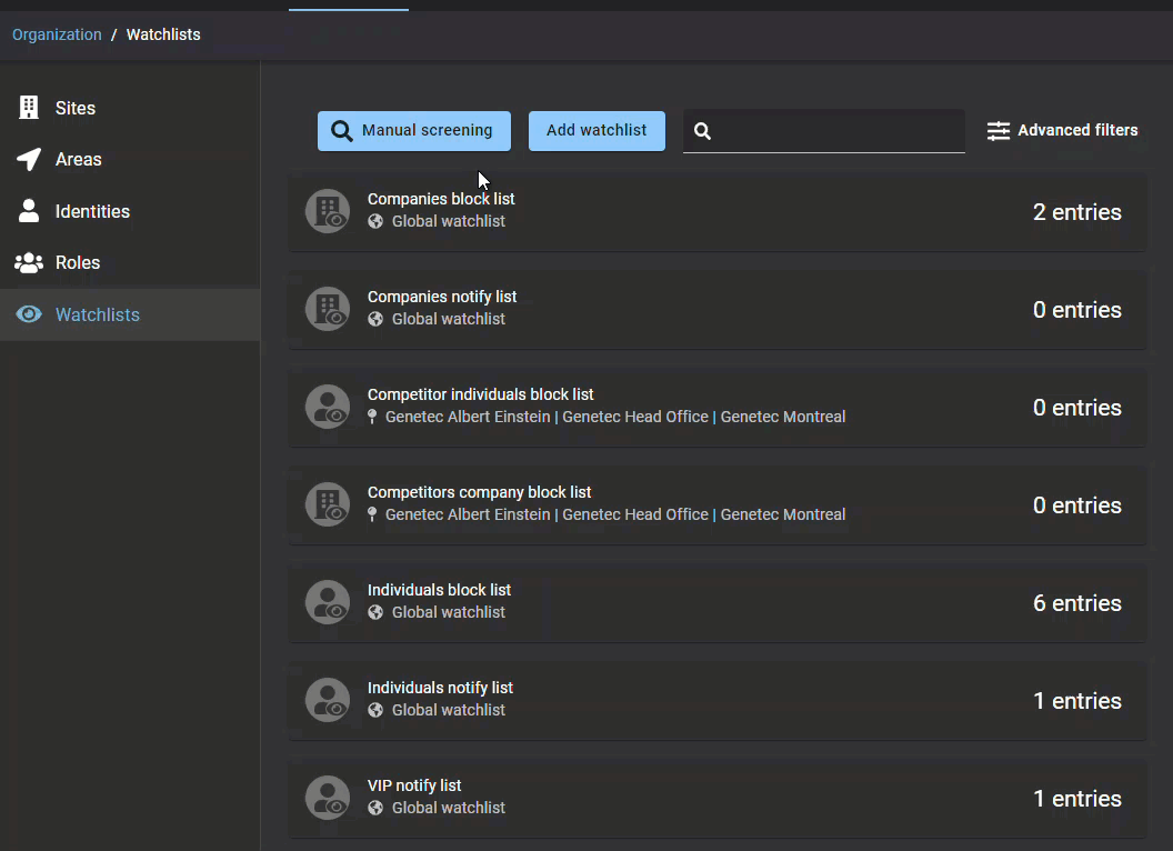 Si les employés de sécurité ou de réception doivent contrôler manuellement des visiteurs, l’autorisation Responsable de liste de surveillance doit être ajoutée à leur identité.