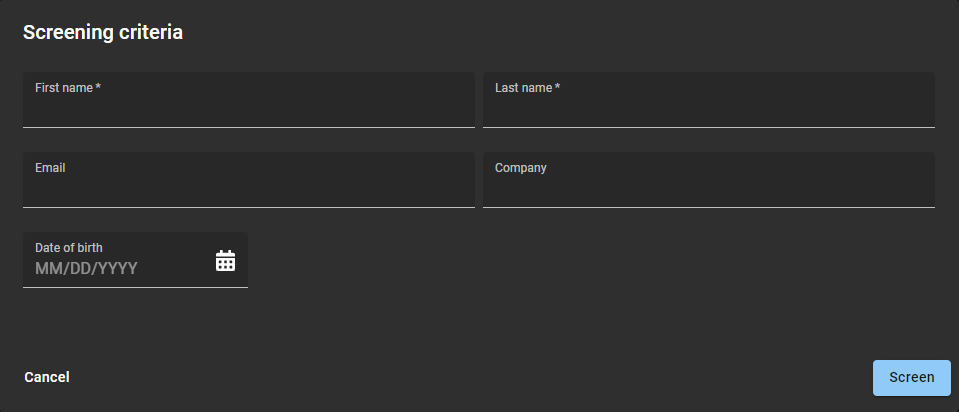 Pour contrôler un visiteur manuellement, vous pouvez saisir des informations pour rechercher des correspondances. Par exemple, tester une nouvelle liste de surveillance pour y trouver des listes qui contiennent une personne ou une société particulière, ou pour valider une nouvelle recrue en interrogeant une liste de surveillance interne.