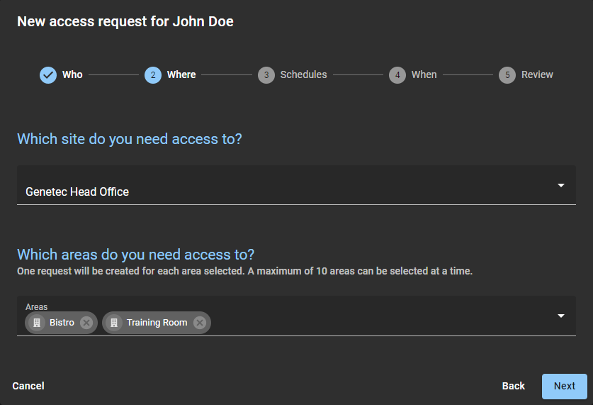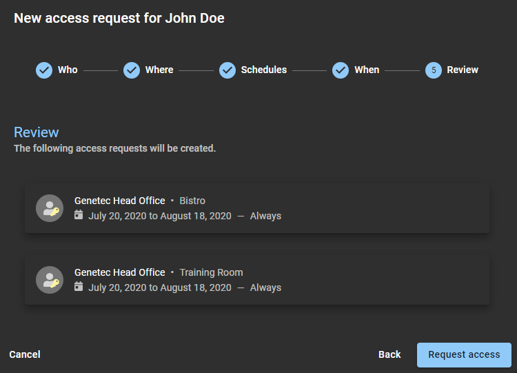 L'assistant Nouvelle demande d'accès est mis à jour pour inclure les informations de la personne sélectionnée.