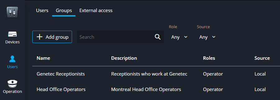 Selecteer in Genetec Configuration web de optie Gebruikers in de linkerzijbalk en klik op het tabblad Groepen.