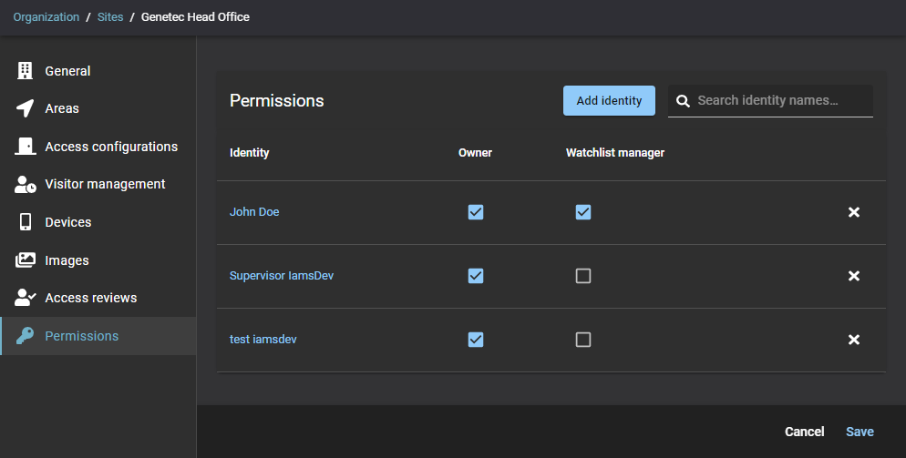 (Optioneel) Klik op Identiteit toevoegen om identiteiten toe te voegen aan de lijst met sitemachtigingen .