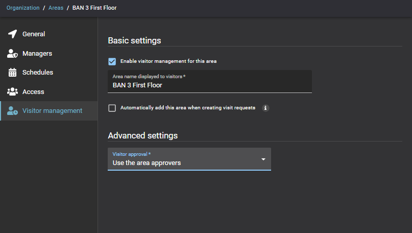 Selecteer de optie Bezoekersbeheer voor dit gebied inschakelen om bezoekersbeheer voor dit gebied in te schakelen.