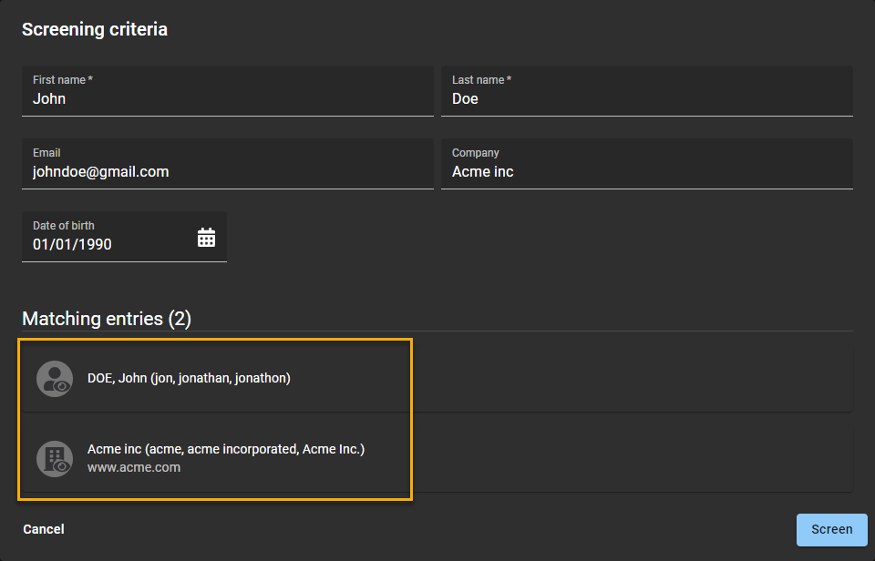 Overeenkomende vermeldingen voor personen of bedrijven worden weergegeven in de lijst Overeenkomende vermeldingen in het dialoogvenster Screeningcriteria.