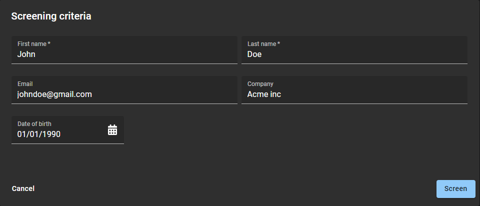 Als u een bezoeker handmatig wilt screenen, kunt u de bezoekersgegevens invoeren om te controleren of er een screeningmatch is. Bijvoorbeeld het testen van een nieuwe watchlist om watchlists te vinden die een interessante persoon of bedrijf bevatten, of om een nieuwe medewerker te valideren aan de hand van een interne watchlist.