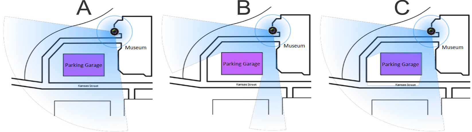 C Block field of view is selected for the rectangle representing the parking garage and the Elevation is defined for both the parking garage and the camera.