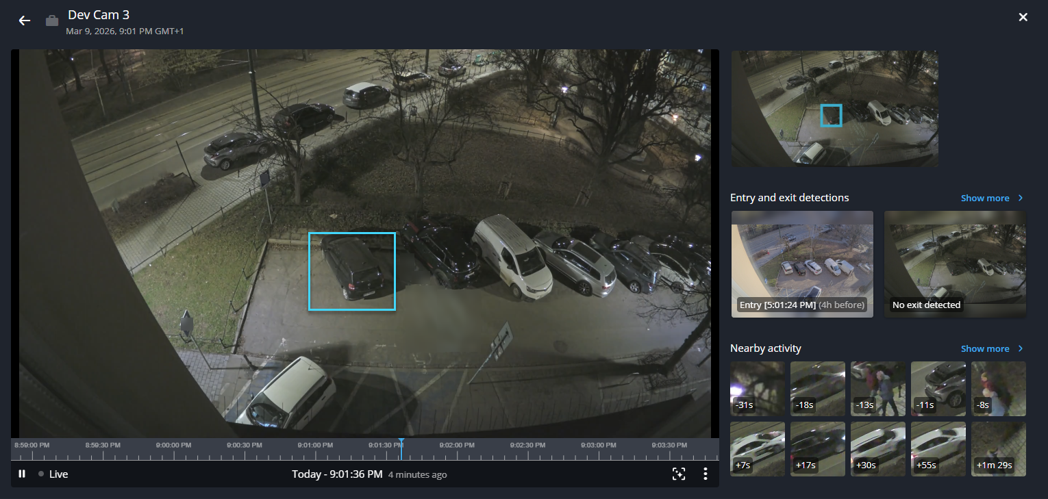 around it. Thumbnails of entry and exit detection and nearby activity are shown.