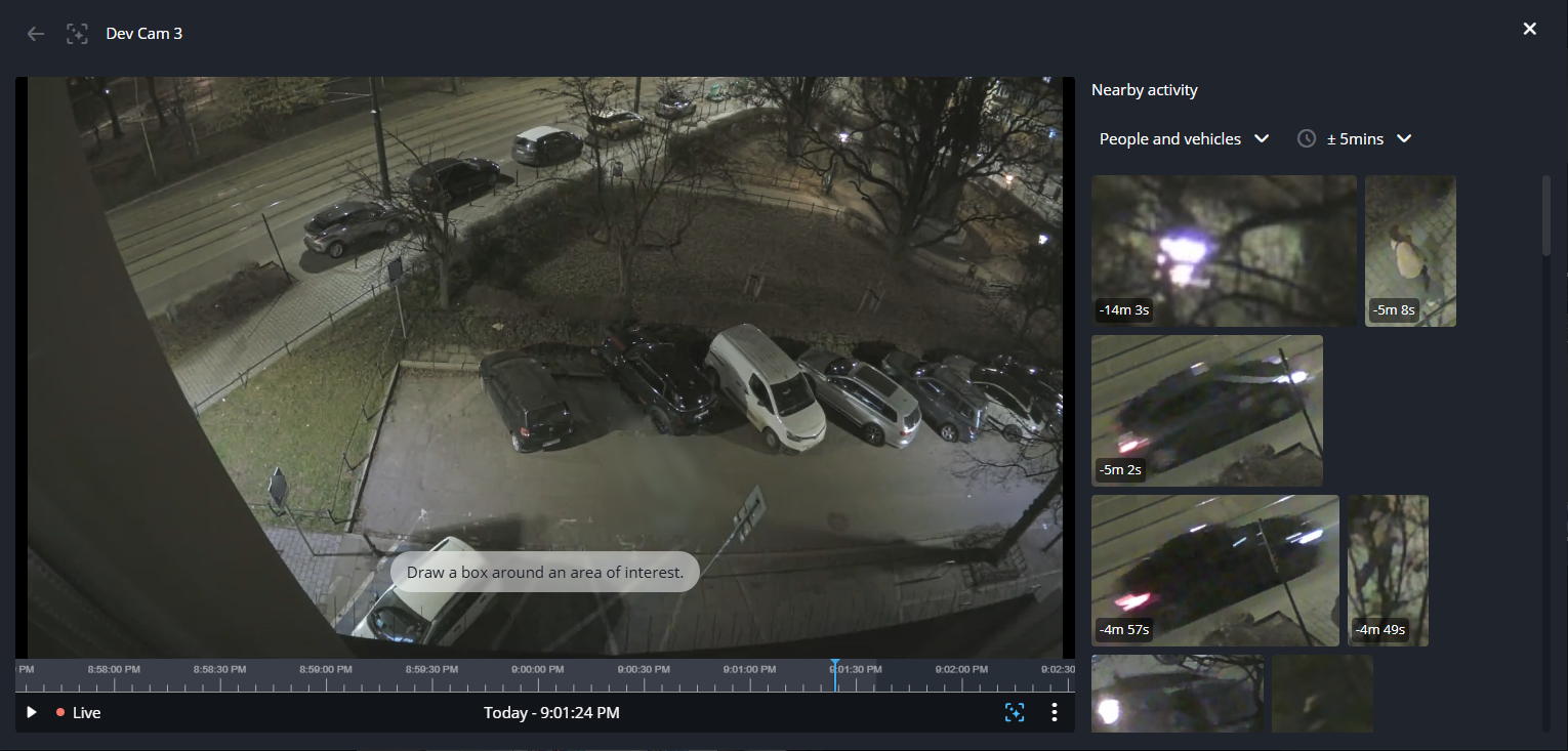 - To investigate a person in the camera's view, draw a box around them. Thumbnails of similar individuals and nearby activity are shown.