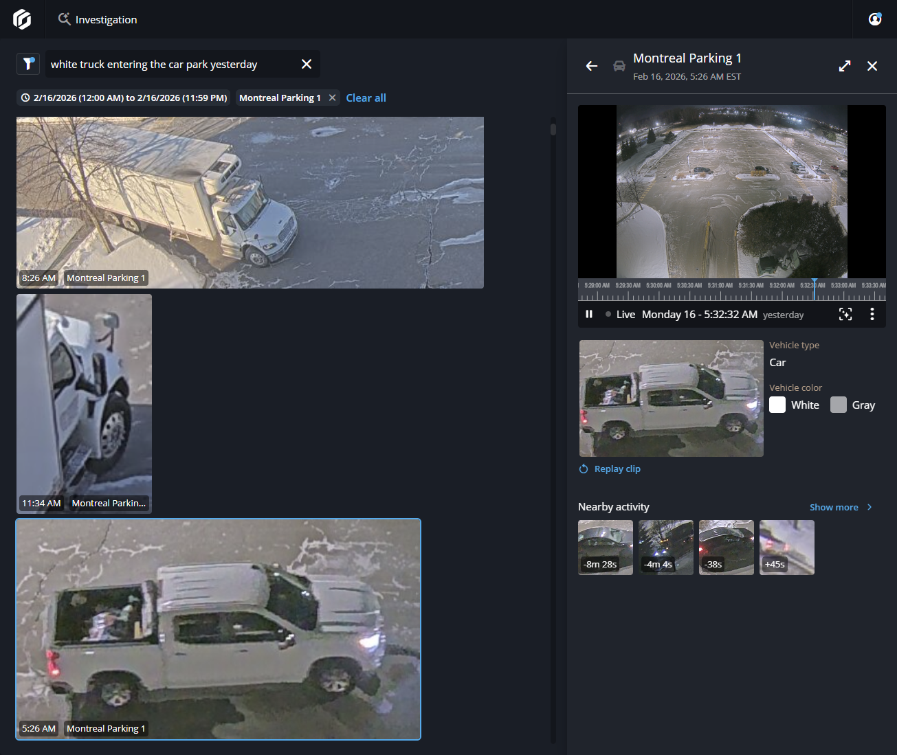 - Discover what happened before or after an incident by finding nearby activity within a selected time range. Then review the results to reconstruct possible suspicious activities or verify movements before and after an incident.