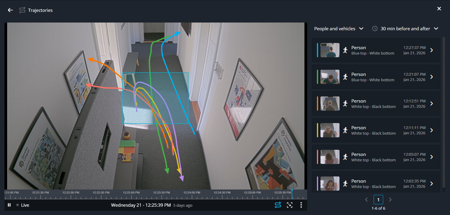 Using visual trajectory search, you can observe how people and vehicles moved through a